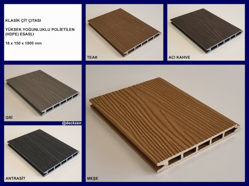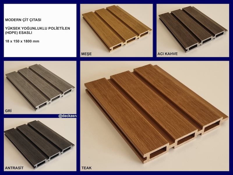 Ahşap görünümlü plastik kompozit çit ürünlerimiz inceliği ve birbirine geçme sistemi ile dekorasyonda zarifliği ve sağlamlığı ön plana çıkaran, yapılarınıza değer katan, yüksek yoğunluklu Polietilen ve organik ahşap tozu karışımından üretilen dekoratif kompozit çit modeli ürünlerimizdir.